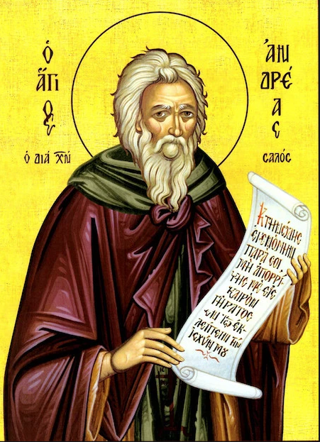 St. Andrew lived from 450 to 515 A. D. He was a Scythian. He is called “a fool for Christ” (salos), because while he was most wise and holy he feigned foolishness and idiocy for the Lord, literally applying for himself St. Paul’s saying: ‘If anyone among you thinks that he is wise in this age, let him become a fool that he may become wise” (I Corinthians, 3:18).